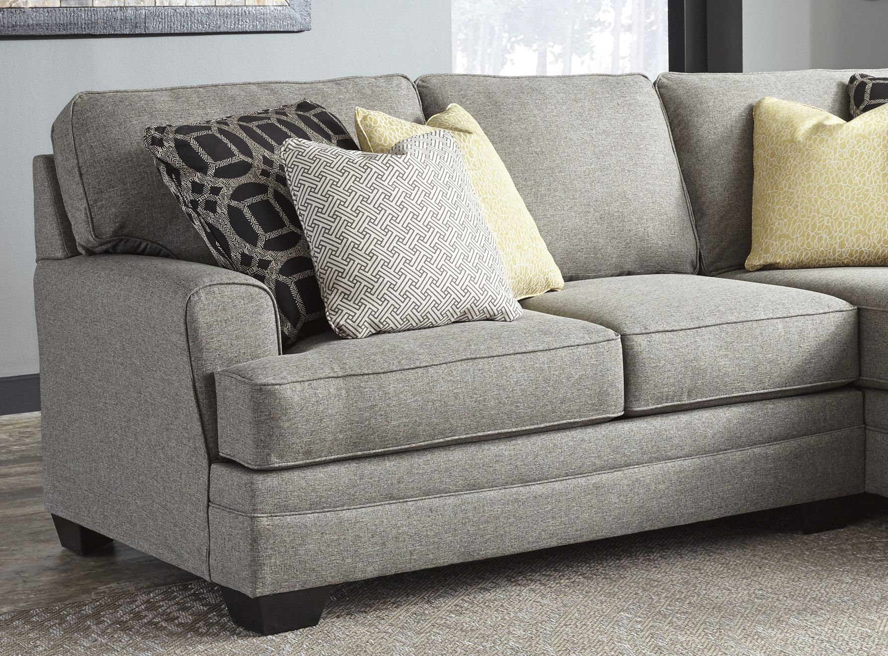 Clean, simplistic, and expansive, the Cresson cuddler offers ample space to relax with that warm feeling of familiarity and closeness. The couch’s modular design invites you and your guests into an intimate atmosphere—without feeling confined or squished. Dark faux-wood legs are a striking contrast to the loveseat, rendering it handsome and functional. This is more than a standard couch or loveseat; it is a “cuddler” after all. Bring this Benchcraft cuddler into your home to experience its cozy comfort.