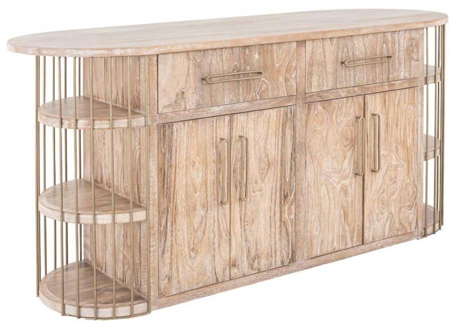 Six open shelves, supported by gold-aged metal bars, serve as a display for your favorite kitchenware and pantry items, while four doors and two deep drawers help keep your kitchen organized.