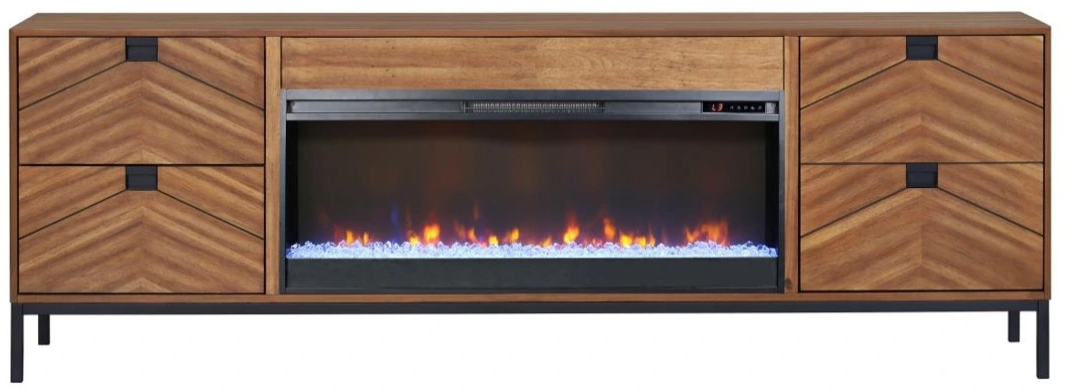 Bring home the Astoria 84-inch fireplace TV stand to furnish your living room in modern, contemporary style. Crafted from acacia solids and veneers, this showstopping entertainment center with fireplace features a crisp chevron pattern in a natural finish that beautifully showcases the unique characteristics of the wood grain with a black metal base and hardware.Read More