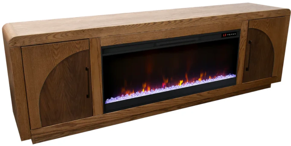 Bring Home the Eclipse 82-inch fireplace TV stand for sophisticated, reimagined vintage style. Beautifully crafted from oak solids and veneers and walnut veneers, this Entertainment Center with Fireplace rests atop a crisp plinth base and features striking two-tone finish inlay arch panels on the doors that mirror the curves of the top corners.Read More