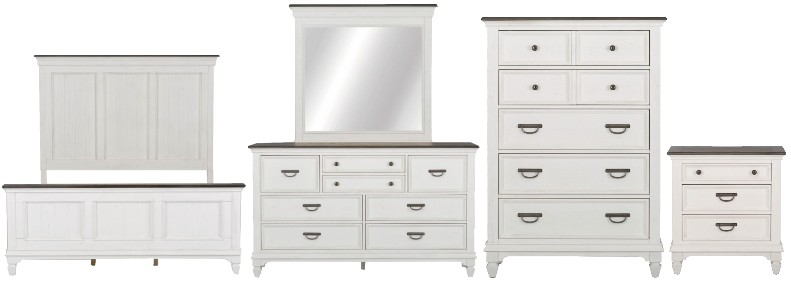 Bring beauty indoors with the Allyson Park queen panel bed, dresser, mirror, chest, and nightstand. Crafted of pine solids and veneers with cathedral white oak tops, this kit features a wire brushed white finish with planked charcoal tops, bead molding, full extension drawers with felt lined top drawers.Read More