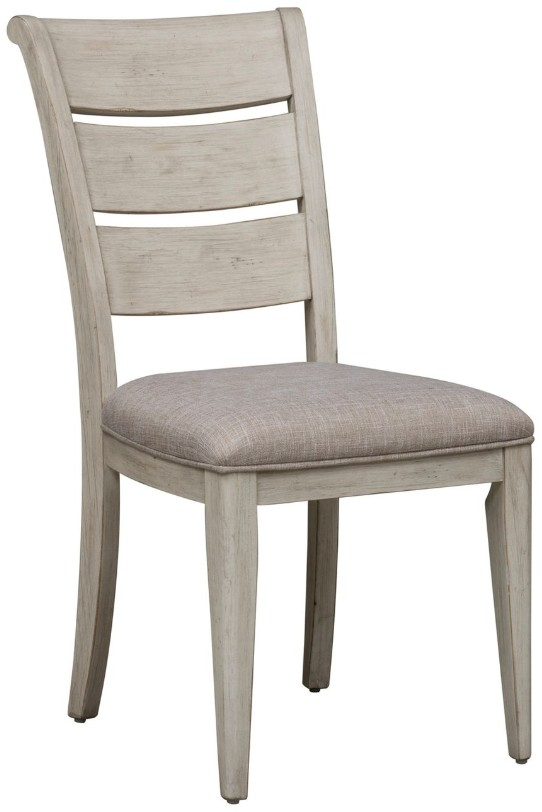 Sit in comfort and style with the Farmhouse Reimagined ladder back upholstered side chair. Crafted of rubberwood solids, this piece features a timeless antique white finish, khaki linen upholstered seat for added comfort, nylon chair glides to protect your flooring, and is anchored by beautifully tapered legs.Read More
