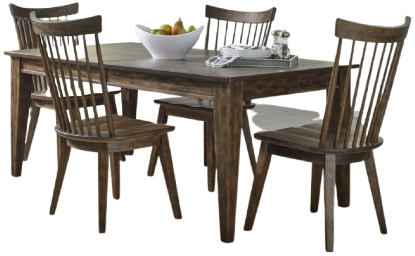 The table includes an eighteen inch removable leaf on a wood guide with metal gear leaf track system. The ends of the tabletop showcase a breadboard veneer pattern that draws the eye to the over scaled square tapered legs. The spindle back side chair and bench are the perfect marriage of classic design and rustic charm. The curved spindle back offers both support and grace, while the saddle shaped seat of the chairs adds for comfort. The square tapered legs are adorned with nylon chair glides, ensuring floor protection. The Midland Falls six piece rectangular table set will become the central hub for family gatherings, creating memories to be cherished for a lifetime.