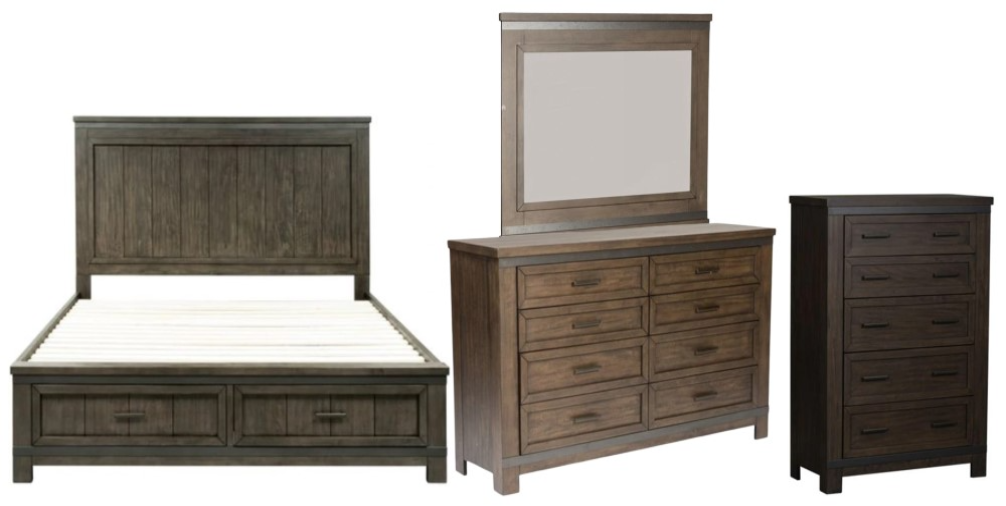 Elevate your home with the Thornwood Hills king storage bed, dresser, mirror, and chest. Crafted of rubberwood solids with mango veneers, this kit features a rock beaten grey finish with saw cuts, straight line cases with wide pilasters and block feet, metal strip accents, planked tops and side panels, wood framed drawer fronts.Read More