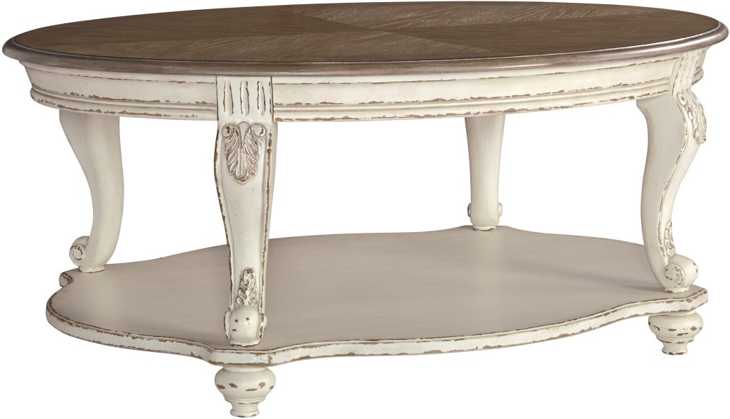 Elevating the art of traditional cottage styling, this oval coffee table is sure to serve you beautifully for years to come. Antiqued two-tone aesthetic blends a chipped white with a distressed wood finished top for added charm. Classic cabriole legs and shapely lower shelf are a lovely twist. Decorative corbels add refinement.Read More