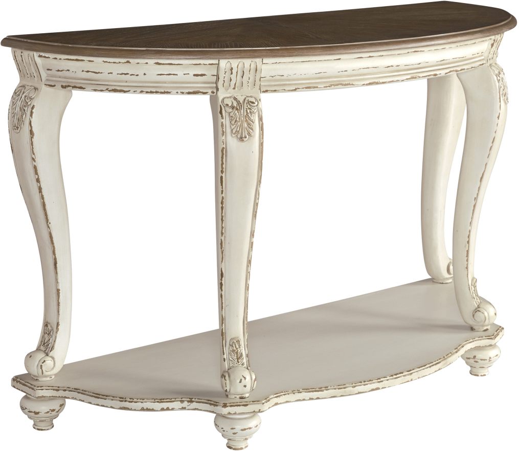 Elevating the art of traditional cottage styling, this demilune sofa table is sure to serve you beautifully for years to come. Antiqued two-tone aesthetic blends a chipped white with a distressed wood finished top for added charm. Classic cabriole legs and shapely lower shelf are a lovely twist. Decorative corbels add refinement.Read More