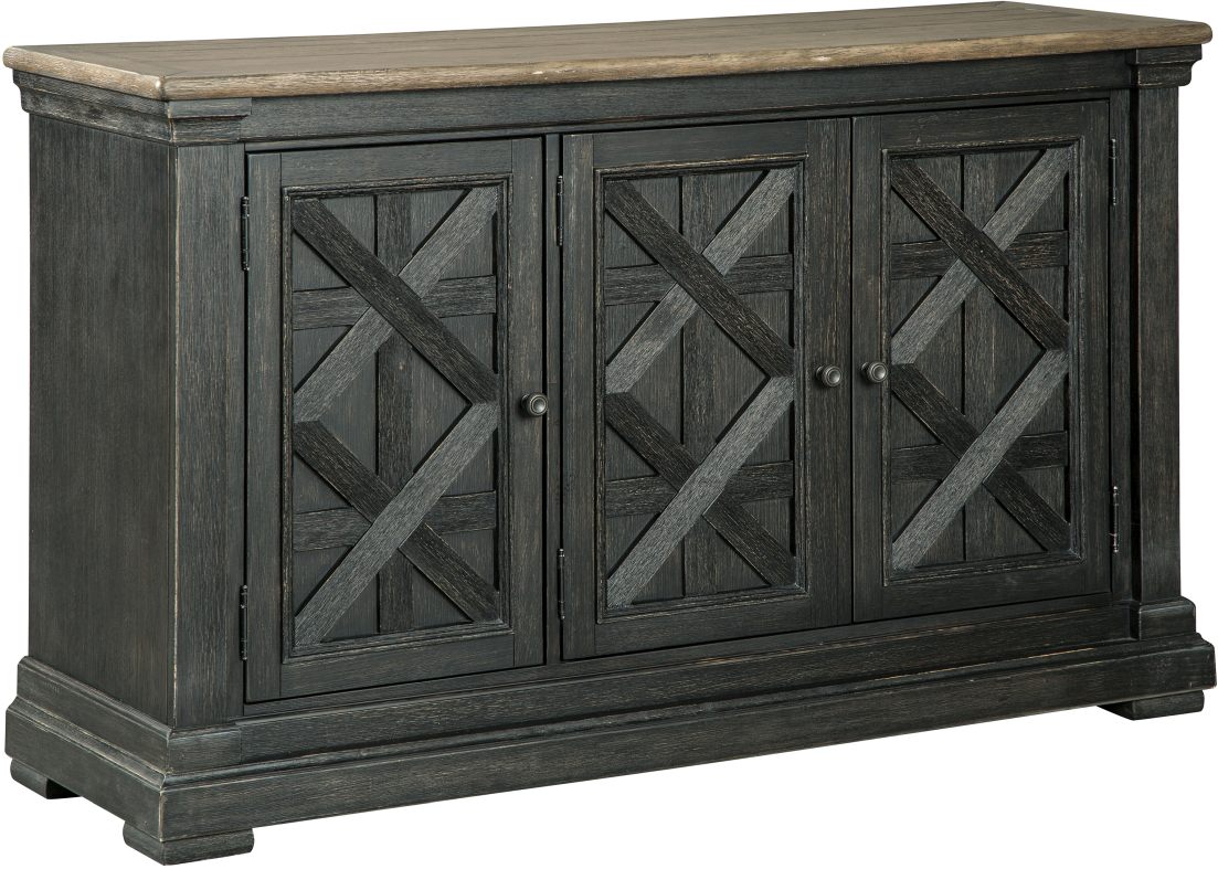 Invite your family into the heart of your home with this dining room server. Its beautifully textured black finish and timeworn planked oak top create a unique two-tone contrast. A charming lattice design graces the front of the doors. Thick pilasters add to the sturdiness of the foundation.Read More